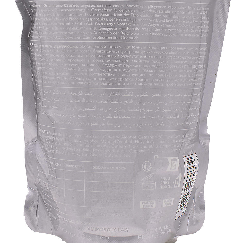 Aqua (Water), Hydrogen Peroxide, Cetearyl Alcohol, Ceteareth-30, Paraffinum Liquidum (Mineral Oil), Stearamidopropyl Dimethylamine, Lauryl Alcohol, Myristyl Alcohol, Hexyldecyl Laurate, Hexyldecanol, Etidronic Acid, Tetrasodium EDTA, Oxyquinoline Sulfate, Simethicone, Ceteareth-20, Laureth-3, Propylene Glycol, Glycerin, Garcinia Mangostana Fruit Extract, Hydrolyzed Silk, Phenoxyethanol, Caprylyl Glycol, Chlorphenesin, Ethylhexylglycerin, Tetrasodium Glutamate Diacetate, Hexylene Glycol, Butylene Glycol.