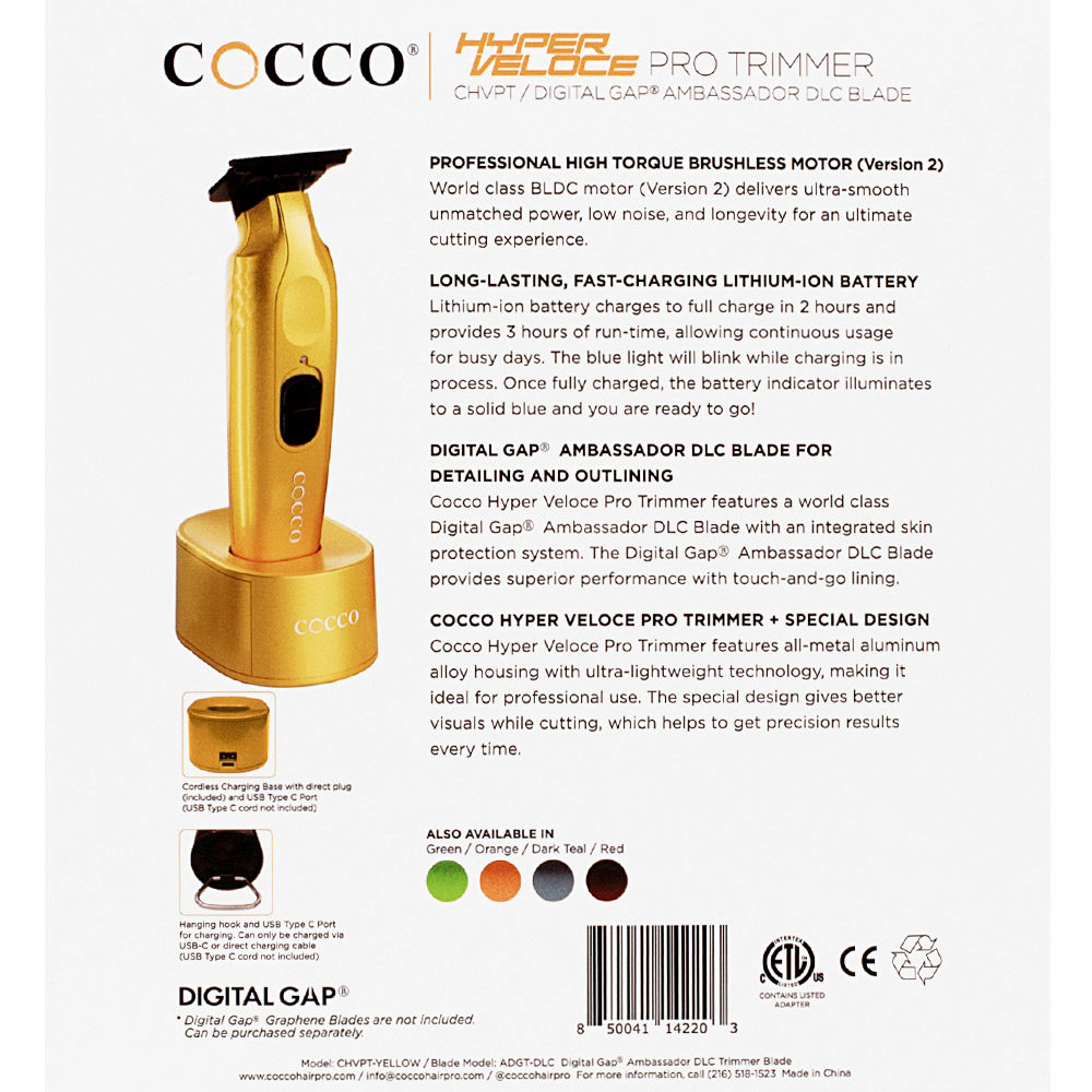 Der Hyper Veloce Trimmer ist der Premium-Trimmer von Cocco Hair Pro, der für sein lebendiges und farblich abgestimmtes Design bekannt ist.
