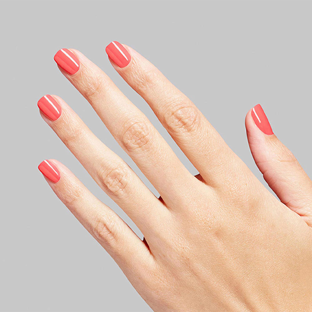 Nach der Vorbereitung der Nägel eine dünne Schicht OPI Natural Nail Base Coat und anschließend zwei dünne Schichten Nagellack auf. Zum Abschluss eine dünne Schicht OPI Top Coat auftragen.