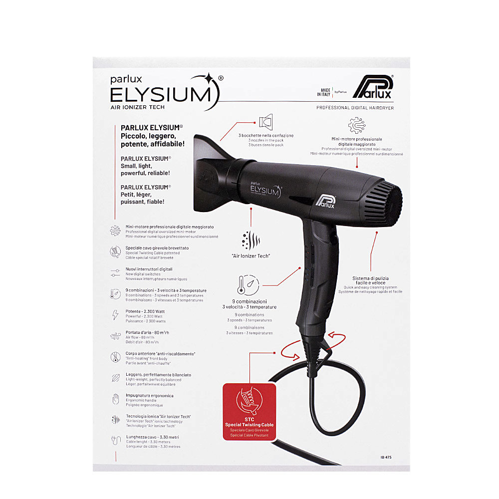 Parlux ELYSIUM zeichnet sich als professioneller digitaler Mini-Haartrockner aus, der mit einer Struktur ausgestattet ist, die repariert und nicht ersetzt werden kann.